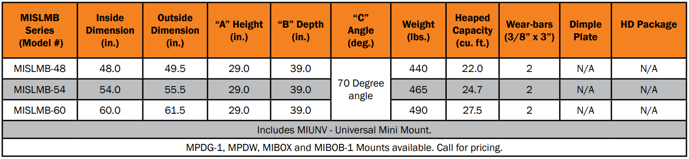 For UTHB, FMX, HCSB, HVMB, CAL, & MISLMB series buckets: Cubic Feet ÷ 2.5 = Heaped Amount + Cubic Feet = Heaped Capacity