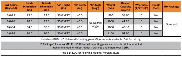 For UTHB, FMX, HCSB, HVMB, CAL, & MISLMB series buckets: Cubic Feet ÷ 2.5 = Heaped Amount + Cubic Feet = Heaped Capacity
