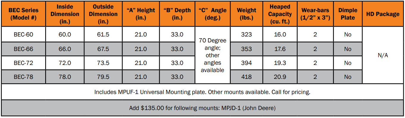 For B, BEL, BELHD, UT, CCT, BEC, MIB, & MIBEL series buckets: Cubic Feet ÷ 3 = Heaped Amount + Cubic Feet = Heaped Capacity
