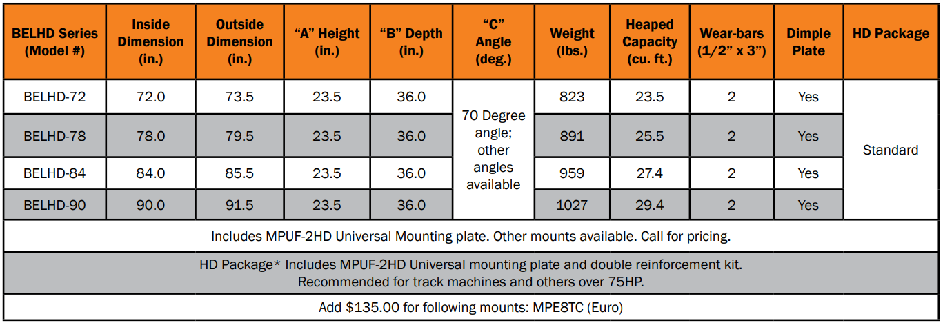 Berlon’s Heavy Duty Extended Lip bucket provides greater cutting edge visibility while standard heavy duty package makes it ideal for machines 75HP and greater.