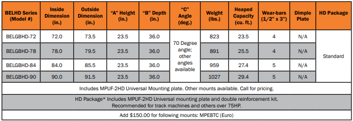 For B, BEL, BELHD, UT, CCT, BEC, MIB, & MIBEL series buckets: Cubic Feet ÷ 3 = Heaped Amount + Cubic Feet = Heaped Capacity