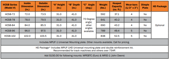 For UTHB, FMX, HCSB, HVMB, CAL, & MISLMB series buckets: Cubic Feet ÷ 2.5 = Heaped Amount + Cubic Feet = Heaped Capacity