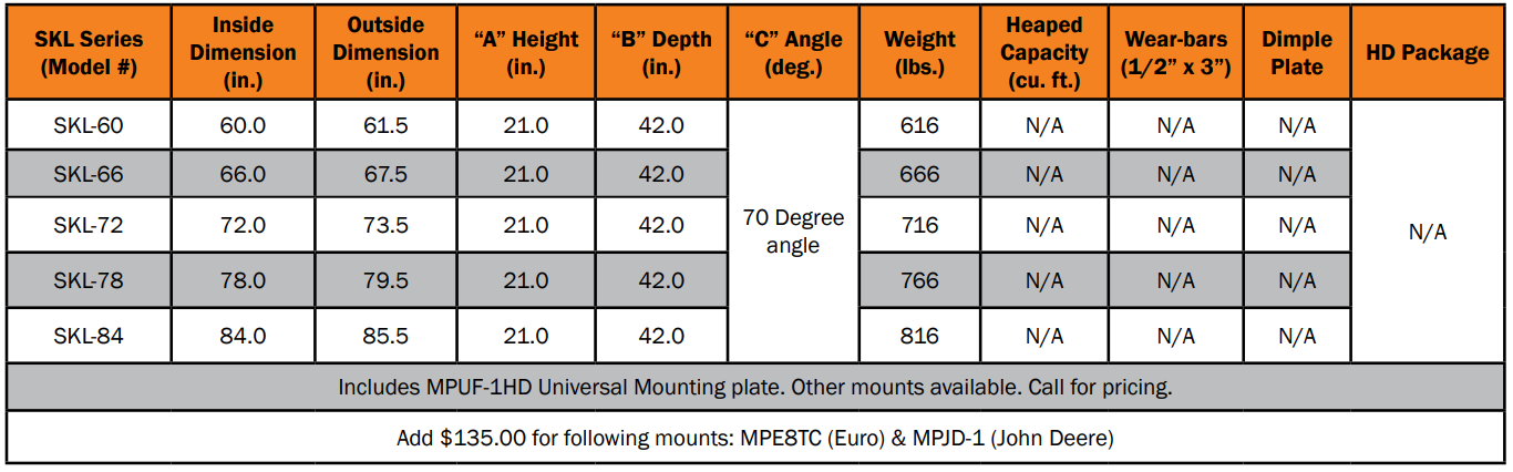For UTHB, FMX, HCSB, HVMB, CAL, & MISLMB series buckets: Cubic Feet ÷ 2.5 = Heaped Amount + Cubic Feet = Heaped Capacity