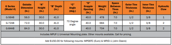 Our most popular model. The G-SERIES is ideal for removing debris, woodlot cleanup, general agricultural applications, manure cleanup, moving bales, and clearing areas. The open bucket construction allows smaller items and dirt to sift through leaving a cleaner load.