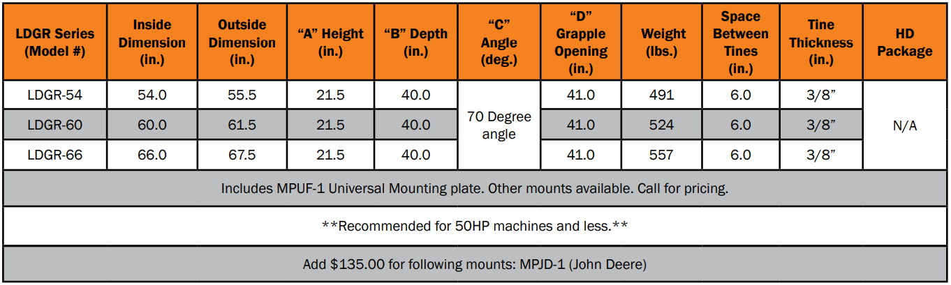Berlon’s Light Duty Grapple is ideal for today’s compact tractors and small skid loaders. It is recommended for machines with 50HP or less.