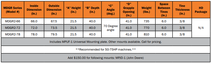 Berlon’s Medium Duty Grapple is designed for moving brush, logs, rocks, and clearing fence lines. It is the ideal attachment for machines between 50-75HP